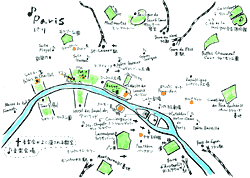 このページを書くにあたり、読み返していますが、行ってない所、知らなかった事柄が一杯です。皆さんも、やりたいことが全部出来るとは思わないで、次の楽しみに取っておこうというくらいの気持で、したいことを考えておいて下さい。ここでは、いくつか、散歩の案を書いておきます。地図は、パリ市内の概略図です。オペラ座、音楽ホールや、教会の位置が大体つかめるでしょう。 |